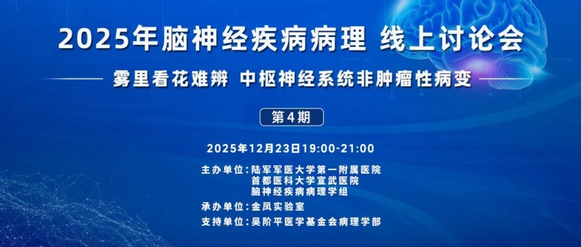 为加强脑神经疾病病理学学术交流,提升病理医师精准诊断水平,由陆军军医大学第一附属医院、首都医科大学宣武医院主办,金凤实验室承办,吴阶平医学基金会病理学部支持的“2025年脑神经疾病病理线上讨论会(第四期)”,将于2025年12月23日(星期二)19:00—21:00举办!..2025-12-18