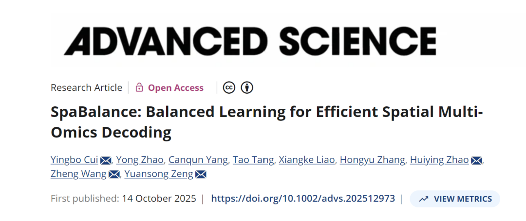 近日,金凤实验室生信中心团队联合中山大学科研团队,在国际期刊Advanced Science发表了题为“SpaBalance: Balanced Learning for Efficient Spatial Multi-Omics Decoding”的研究论文,提出了一种全新的AI计算框架,用于高效整合空间多组学(spatial multi-omics)数据,有望显著提升组织样本中空间结构和分子调控网络的识别与理解。