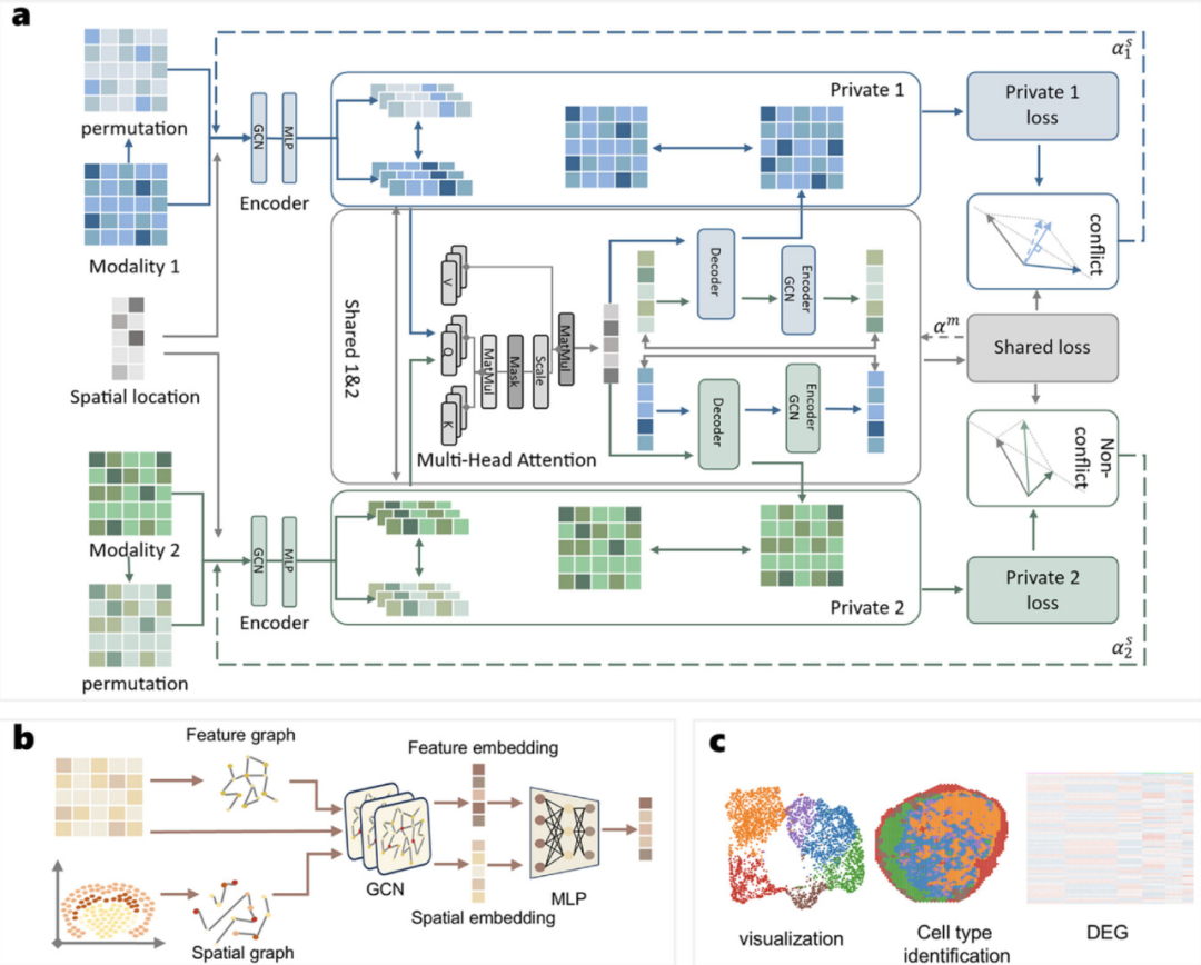 • 空间图+多头注意力机制:结合空间坐标与组学特征,构建空间邻近图(spatial graph),并通过多头attention整合跨组学信息,以兼顾空间邻域关系与分子特征互补。