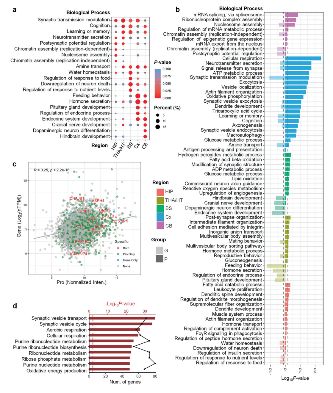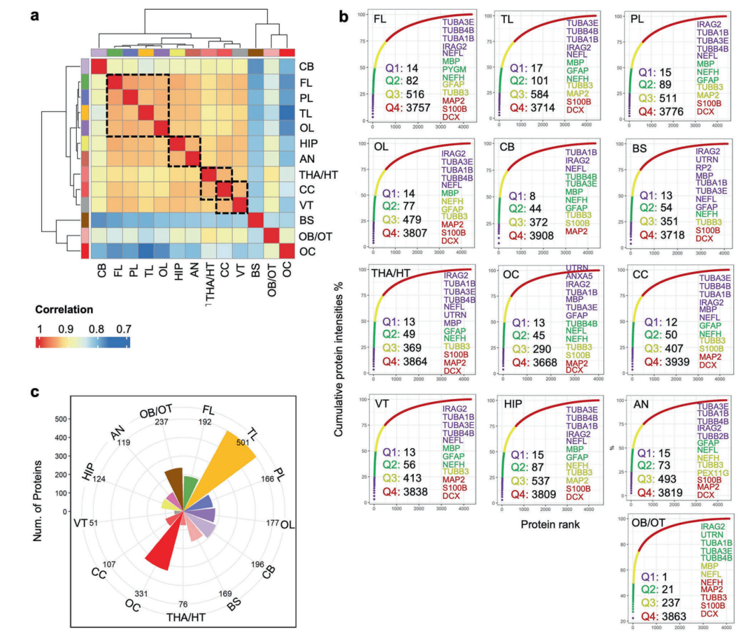 尽管此前转录组研究已初步揭示大脑区域的功能差异,但蛋白质作为生命活动的直接执行者,其区域特异性分布与功能关联仍不清楚。本研究通过对8名遗体捐赠者的13个脑区(包括四个脑叶、边缘系统、脑干等)进行深度蛋白质组学分析,共鉴定出4,660种蛋白质,其中85%~95%的蛋白质在各脑区普遍存在,但表达水平呈现显著区域特异性。