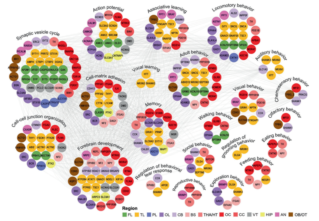 ▲基于STRING数据库构建的脑区特异性高表达蛋白互作网络