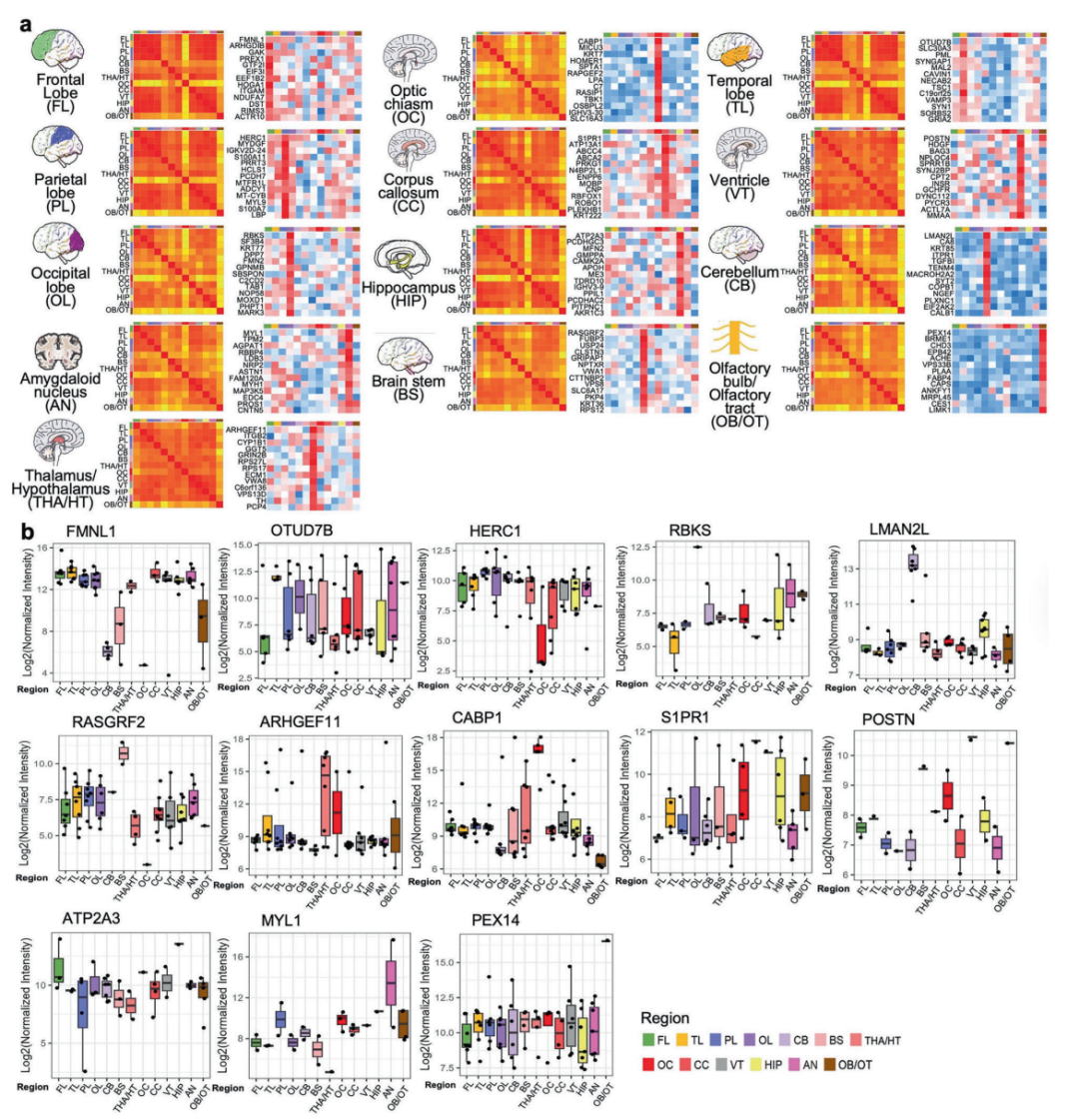 ▲各脑区代表性高表达蛋白谱系及其跨区域表达特征对比